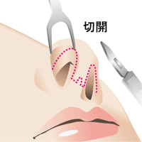 クローズ法と異なり、傷が鼻柱部に露出しますが殆ど目立ちません。鼻尖部皮下を剥離して進め、鼻尖の皮下組織を除去し、鼻翼軟骨・鼻中隔軟骨を露出させます。鼻翼軟骨が下方に無理なく伸びる(延長する)まで剥離したら、特殊な専用器具を用いて、鼻中隔軟骨を繰り抜き採取します。この時、鼻中隔軟骨のフレームとしての支持性を保つために、L字型に鼻中隔軟骨を残します。繰り抜き採取した軟骨(下図赤色)を「糊しろ」に少し重ねて継ぎ足して、鼻中隔軟骨を延長します。このとき、固定して継ぎ足す位置で下方へ延長したり、前方へ延長(突出)したりすることが可能です。