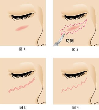 手術例:直線の傷は目立ちますので、傷痕ごとを取り囲むようにzigzagにデザイン切除して丁寧に縫合します。直線の傷よりもzigzagの傷は光の乱反射で目立ちにくく、ぼやかし効果があります。特に額部・頬部の傷に極めて有効な方法です。(図1~4)
