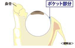 上方向(二重・眼瞼下垂)、内側方向(目頭切開)、下方向(下眼瞼開大術)と3方向に目を広げたら残るは、目尻です。目尻切開をすると外方向にかなり広がるように思われますが、残念ながら効果は限定的です。目尻(外眼角)のすぐ外側には、すぐ眼窩骨がありますし、下図のごとくポケット状に隠れている部分しか広げることができないので効果に限界があります。つまり、この外眼角のポケットが深い方は効果が出やすく、ポケットが浅い方は効果が出にくいことになります。時折、他院でこのポケット以上に切開し、粘膜が露出して悲惨な結果になっている方を見かけますが絶対にしてはいけないことです。ポケットが浅くて、効果の出にくい方も下眼瞼開大術を併用することにより、お互いに相乗効果を引き出すことも可能です。この方法は手術手技に技術が求められるのは勿論ですが、実際に適応があるのか正確な診断能力が求められます。