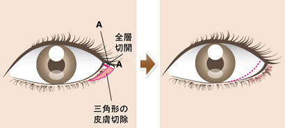 目尻切開は、単に目尻を切って縫うだけでは全く効果がありません。図のAように外眼角の皮膚・粘膜切除し、皮弁をずらして縫合します。それによって目尻外側だけでなく、上下方向にも 白目の露出が大きくなります。下眼瞼開大術(たれ目)と組み合わせれば、より効果的となります。この手術で延長された部分はマツ毛が欠如することになります。マツ毛が欠如した部分にアイラインを入れると、目尻を外側に長くした効果がより実感できます。