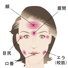 表情筋の良い適応は額・眉間・目尻・鼻根部のシワです。