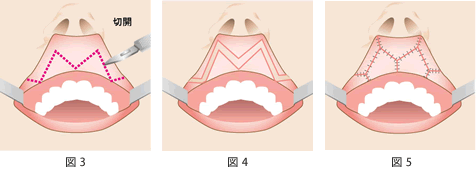 この方法はV-Y進展皮弁法といい、形成外科では皮膚腫瘍などの皮膚欠損に用いる基本的手技です。このV-Y法を互い違いに複数組み合わせて行います。