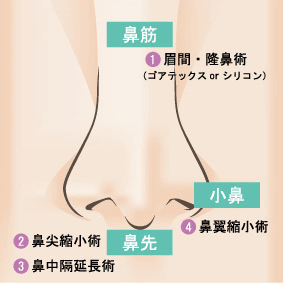鼻の悩みで来院される患者様は、「低い鼻を高くしたい」「団子鼻を細くしたい」「小鼻を目立たなくしたい」などの希望はありますが、具体的には抽象的なイメージしか持っていないと思われます。鼻は顔の中心に位置し、目に次いで顔貌を印象づける重要なパーツです。鼻の手術を細かく分類しているクリニックもありますが、一般の方にも理解しやすいようにできるだけシンプルに解説いたします。右図のように鼻筋・鼻先・小鼻の3ヶ所のパーツに分けて考えます。即ち(1)眉間・隆鼻術(低い鼻根部・鼻筋を高くする)、(2)(3)鼻尖縮小術・鼻尖形成術・鼻中延長術(団子鼻を細くする、上向きの鼻先を下向きに伸ばす)、(4)鼻翼縮小術(小鼻の膨らみを目立たなくする)となります。