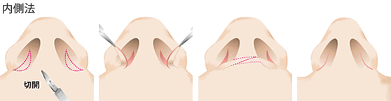 右上図のように鼻孔底幅(鼻翼付け根の幅)が広く、狭くしたい場合⇒内側法